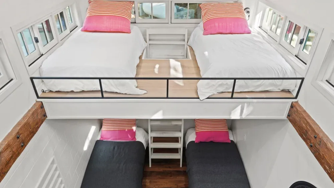 A bunk room accommodating (6) people with a unique loft, private bath, walk-in closet, and library sitting room. It has its own private entrance that spills onto the main patio and is right next to the hot tub deck.